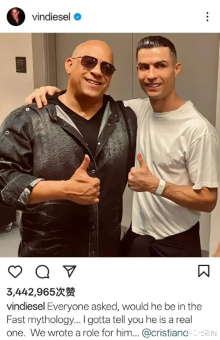 范·迪塞尔晒出和C罗的合照,官宣了这位足坛顶流加盟《速度与激情11》的消息。
